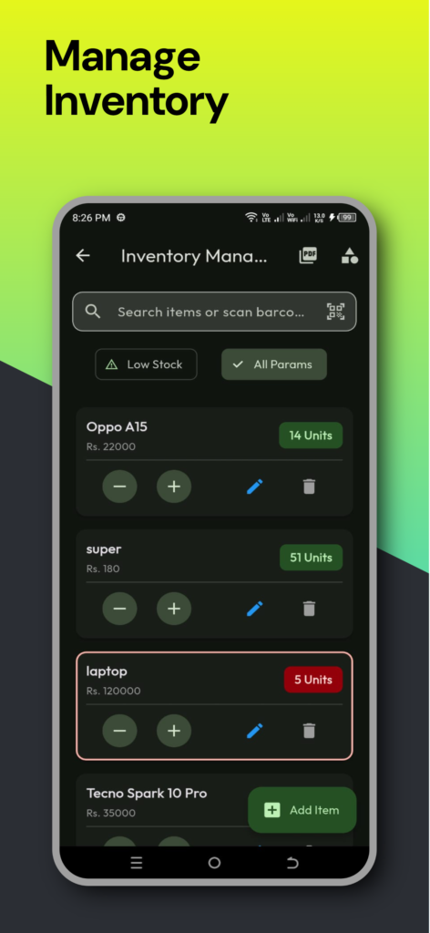 Export comprehensive PDF reports for Sales History, Inventory Status, Expenses, and EMI Summaries.